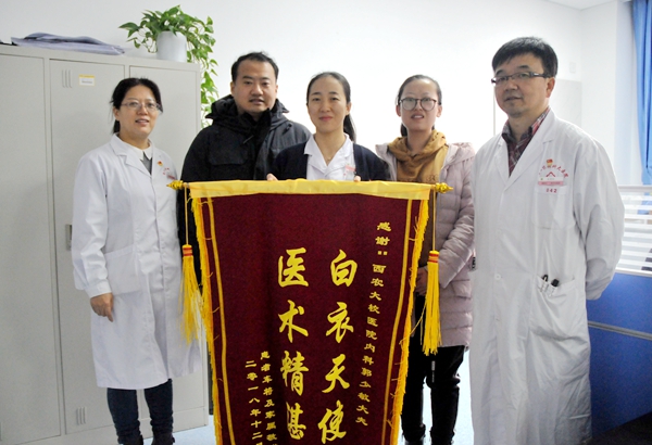 “我发自内心感谢校医院,感谢郭大夫。你们救了我的命!”12月12日早上刚上班,农学院教师车将和爱人专程来到校医院办公室,将写有“白衣天使 医术精湛”八个金黄色大字的红色锦旗送给内科郭少敏主治医师。正是校医院大夫们强烈的责任心和使命感,让心脏冠脉严重病变的车将及时得到救治,用西安交大一附院主刀大夫的话说:“他这条命算是捡回来的!要不是病情控制得好,发现转院及时,怕是连做支架的机会都没有了!”