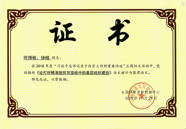 近日,人文社会发展学院公共管理系主任何得桂副教授和硕士研究生徐榕撰写的《论打好精准脱贫攻坚战中的基层组织建设》,在全国2018年度习近平总书记关于扶贫工作的重要论述主题征文活动中被评为获奖论文,这也是我校专家学者认真学习贯彻落实习近平新时代中国特色社会主义思想的一项重要成果。