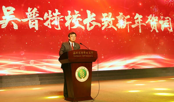 校长吴普特致新年贺词,对2018年学校核心办学指标取得新进展、履行使命助力乡村振兴战略、增强保障能力促进学生成长成才等方面取得的成绩给予了充分肯定,号召全校上下一如既往,以习近平新时代中国特色社会主义思想为指引,深入贯彻全国教育大会精神,坚定百年发展目标,自觉履行国家使命,砥砺奋进铸伟业,同心协力谱新篇。