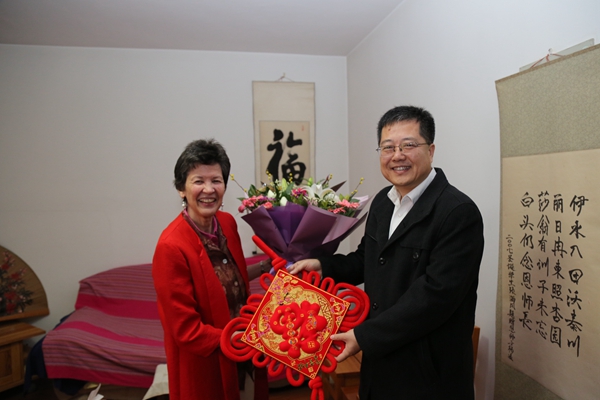 在外籍教师Elizabeth Mary Anderson 、Karen Elizabeth Siggins住处,罗军为他们送上了鲜花和水果和节日的祝福,询问了外教在工作生活方面存在的困难与需求,并对各位外教不远万里来到学校,为学校发展以及促进文化交流做出的贡献表示感谢。