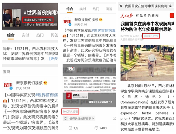 近日,我校许晓东课题组在病毒中首次发现朊病毒,在《自然•通讯》在线发表了题为“一个具有朊病毒特性的病毒表达因子”的研究论文。该消息迅速被多家中央级媒体关注报道,并且登上了微博热搜#世界首例病毒中的朊病毒#,话题阅读量达到1.6亿。