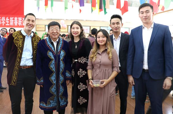 哈萨克斯坦留学生为吴普特送上民族服饰(王婷 摄)