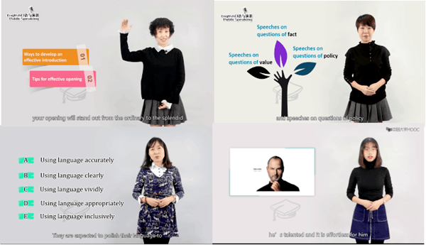“口语与演讲”课程是我校第二批在线课程建设项目,课程团队由张晓容、李敏、范琳和韩芳婷等四位教师组成。课程立足于课程团队多年的英语演讲教学实践,精讲了十二大主题。课程旨在培养和提高大学生英语语言表达能力和英语演讲能力,使学生从英语语言的单一性向知识的多元化、宽厚型方向拓展转化,是大学英语教学改革的新课型,是当代大学生向世界传播中国声音的有效手段。在教学设计中融入德育教育元素,旨在使“爱国”“敬业”等社会主义核心价值观在学生中内化于心,外化于行,使学生在国际交流中,以更开阔的视野、更自信的姿态、更得体的方式介绍中国文化,发表独到的见解,维护国家尊严,弘扬民族精神。精讲了英语演讲的基本理论,创造过程和演讲技巧。课程题材多元化,演讲主题丰富,涉及社会热点、名人轶事、中国文化、价值观等多种题材。采用多模态教学,本课程结合大量示范性强的演讲视频,通过学生真人秀、情景演绎、实战演练等,构建多模态教学内容,让学习更生动有趣。