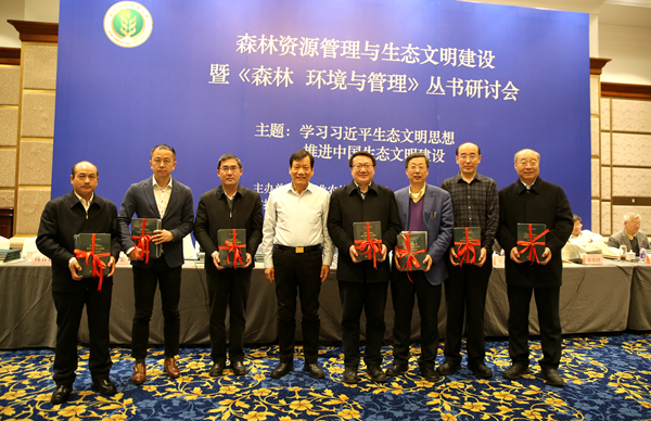 《森林•环境与管理》丛书包括《森林固碳与生态演替》《林木生理与生态水文》《森林资源与生境保护》《森林经营与生态修复》4个分册和《基于森林资源状态的森林生态系统服务功能评价》1本专著,是陈存根教授近50年来在森林生态学领域科研成果的集结。研讨会上,陈存根教授作了题为《总结过去,谋划未来,为建设美丽中国贡献绵薄力量》的主题发言,还向母校及中国生态文明研究与促进会、中国林学会等单位赠书。