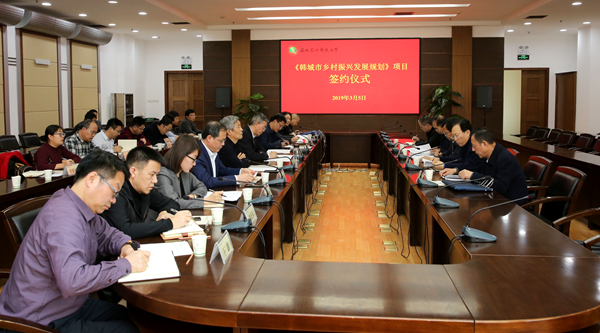 3月5日,我校与韩城市《韩城市乡村振兴发展规划》项目签约仪式在交流中心210会议室举行。副校长钱永华参加签约仪式并在座谈会上讲话,校党委常委、科研院常务副院长韦革宏与韩城市人民政府副市长王文俊代表校地双方签约。
