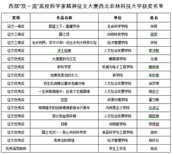 征文大赛旨在深入贯彻落实习近平总书记关于弘扬科学家精神和加强西部地区高等教育事业发展的有关要求,在新时代大学生中厚植爱国主义情怀、培养科学精神和奋斗精神,让“学习科学家、崇敬科学家、感恩科学家”的新风尚在大学生中蔚然成风。活动开展以来,学校认真组织,精心筹划,以“西农精神”的学习为契机,紧密围绕学风建设月组织开展的学习活动,在线上线下广泛宣传,大赛得到了我校学生的积极响应,收集到学生作品近200篇,作品体裁多样,内容丰富,充分展现了西农学子感恩科学家精神,奋发图强,努力奋斗的精神面貌。