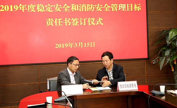 会上,学校稳定安全工作领导小组办公室负责人总结了2018年工作,汇报了2019年工作计划。校党委副书记、学校稳定安全工作领导小组副组长徐养福与学院、职能处室和直附属单位负责人代表签订了2019年稳定安全和消防安全管理目标责任书,副校长马建华、钱永华、郑英宁分别通报了近期高校疫情防控、实验室安全和食品安全情况,并对学校相关工作进行了安排部署。