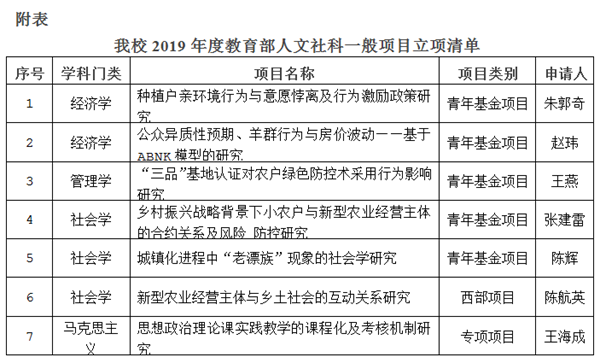 日前,教育部社会科学司公布了2019年度教育部人文社科一般项目评审结果。我校获批7项,其中青年基金5项、西部项目1项、马克思主义学院项目1项。