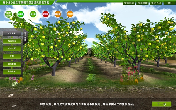 “桃小食心虫全年测报与防治虚拟仿真实验”采用VR技术虚拟现实技术,结合实验室和野外观察,采用虚拟教学的方法,逼真展示桃小食心虫在苹果树发芽前、幼果期、果实膨大期、果实采收期、落叶期五个不同阶段生长发育变化,将苹果的危害情况、调查和测报方法、预防措施等内容,形象、生动、有趣,体验感和交互性强展示出来。突破了传统植物保护实验方法,实现了长时间、多时空的桃小食心虫发展过程的集中展示,学生可以随时随地在三维虚拟环境中开展桃小食心虫虫害观察、调查及防治实验,身临其境地了解和调查各阶段桃小食心虫虫害发生情况。