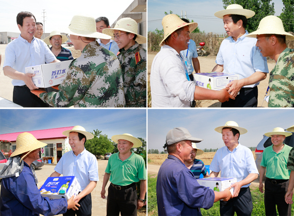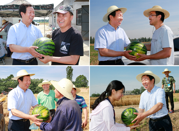 6月14日上午,校党委副书记、工会主席徐养福顶着骄阳带着矿泉水、西瓜先后来到曹新庄试验农场和农学院“三夏”工作现场,慰问奋战在“三夏”一线的师生,为他们送去学校的诚挚关怀。徐养福对师生顶烈日、冒酷暑忘我工作表示崇高敬意,并叮嘱他们要注意防暑降温,保护好身体。