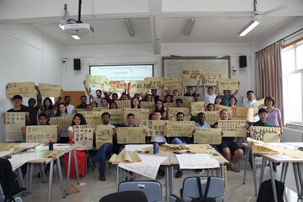 书法,作为我国传统文化之一,也是本次“中国文化周”的第一个体验活动。课堂上,汉语老师首先介绍了书法艺术的特点、练习书法的好处、书法所要用到的工具、“文房四宝”的功能、握笔的姿势及汉字笔画的书写方法,现场国际学生认真听讲,仔细临摹。