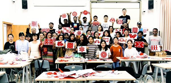 国际学生体验了剪纸和中国结民间手工艺术。“首先找出对称的地方,里面的花纹对折后再剪”,通过讲解,国际学生们认识了中国最古老的民间镂空艺术——剪纸,了解了这门艺术的历史发展、用途和寓意,并学习如何剪纸。在中国学生的帮助下,有的剪出一只美丽的蝴蝶,有的剪出一朵朵可爱的雪花,有的剪出含有美好祝愿的“囍”“福”等字样,一幅幅精美的剪纸作品被呈现出来。