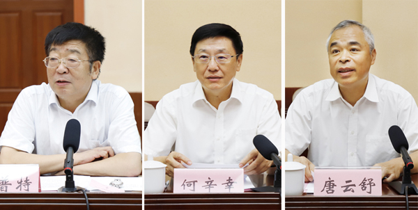 校长吴普特、河池市委书记、市人大常委会主任何辛幸讲话,河池市市长唐云舒主持签约仪式