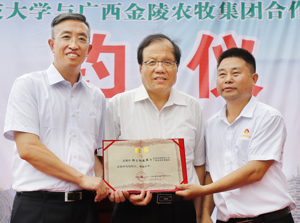 副校长钱永华和广西金陵农牧集团有限公司董事长黄雄为金陵研究院院长杨公社教授颁发聘书