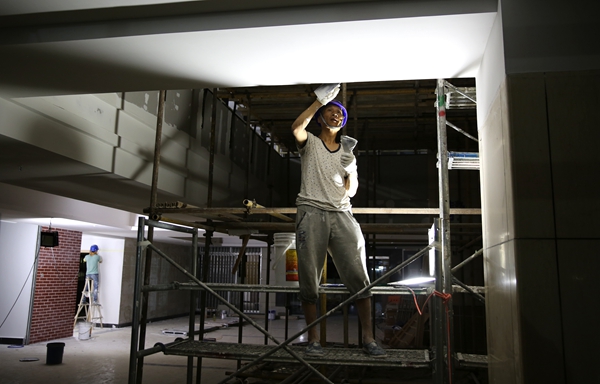 承担不同任务的施工队伍走进8教,拆除、垃圾外运、拆料进场、水电安装、管线安装,等等,各项工作紧张有序地铺开,现场考勤显示,一天中工人最多时达到800人。“坐在凉房里,汗都出个不停,更何况是在没有风扇空调的教室。”“天气太热,戴着头盔,汗就从头上往脖子下淌个不停,蚊子也多。”工人们的感受道出了8教改造的辛苦,但安全教育、施工标准、工期控制在施工企业和监理单位的共同努力下,一点没有放松。