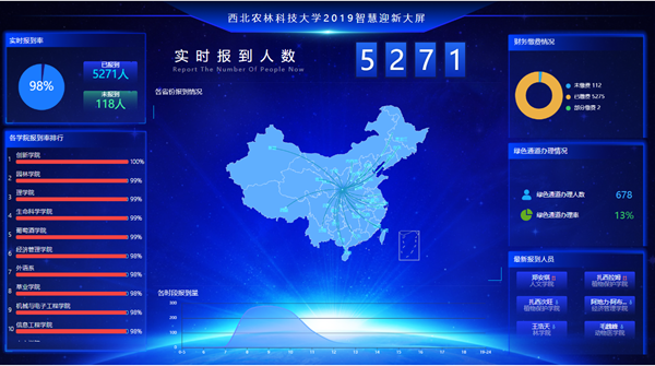 我校“数字迎新系统”通过在后台打通融合多部门数据,做到让数据多跑路,让学生少跑路,确保各部门信息服务交互畅通,实现跨部门信息数据共享、协同工作。利用迎新系统移动端App,新生在来校报到之前即可查询到自己的报道流程、缴费情况、宿舍、辅导员等信息,在报到现场,报到动态可通过工作人员及新生手机随时查看。同时,迎新现场设有大屏,对迎新进展进行实时展示。