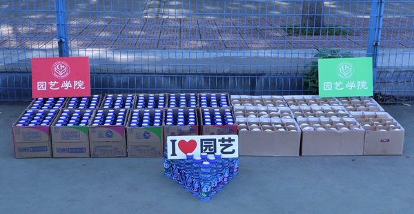 184瓶贴有“畅享园艺”标签的饮料和近200个洛川苹果在炎热的军训场地显得格外亮眼。“我爱园艺“、“盛夏里,遇园艺”,每一张宣传手板都深刻表达出了此刻同学们的心声。
