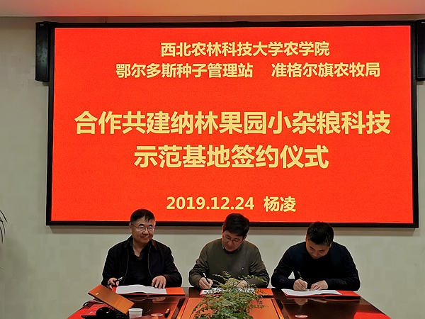 12月24日,我校农学院与内蒙古准格尔旗农牧局和内蒙古鄂尔多斯市种子管理站三方合作共建纳林果园小杂粮科技示范基地在我校正式签约。