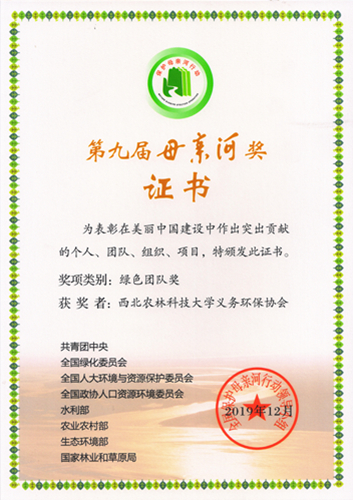 本届“母亲河奖”共设置“绿色卫士奖”“绿色团队奖”“绿色项目奖”“绿色贡献奖”四个奖项,其中“绿色团队奖”全国共计20个,我校义务环保协会作为陕西省唯一获奖团队,成功突出重围,获得殊荣。