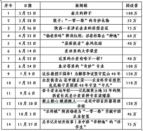 2019年,新华社10余次来校深入采访,内容涵盖一带一路、旱作农业、生态文明、粮食安全、农技推广、学校特色专业等方面,采用深度报道、视频新闻、专题片、图片新闻、内参调研等多种采访报道形式,刊发深度稿件14篇,总阅读量900多万次。