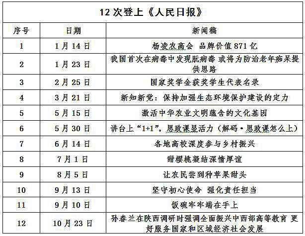 2019年,我校12次登上《人民日报》。10次登上中省报纸头版。10月12日,《中国教育报》第4版整版刊登《绿了荒山 红了梅杏——西北农林科技大学专家助力宁南山区发展见闻》。12月19日,《光明日报》第5版红船初心特刊,整版聚焦西北农林科技大学主题教育的做法和成效。