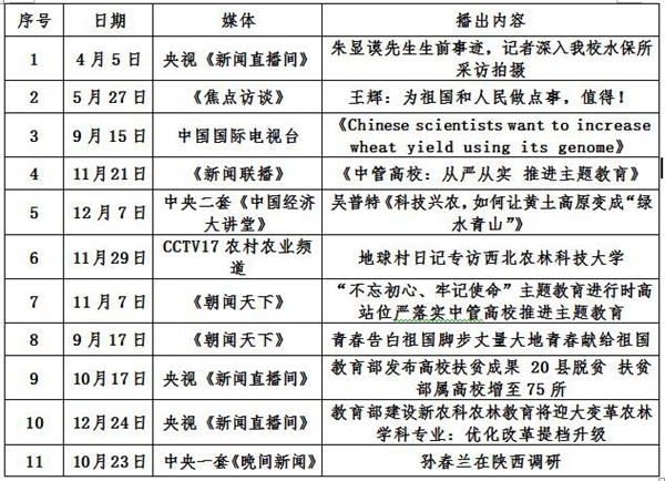 2019年,我校11次登上中央电视台,包含新闻联播、焦点访谈、朝闻天下、新闻直播间等栏目。报道了我校在“不忘初心,牢记使命”主题教育、服务“三农”、生态保护、新农科建设、脱贫攻坚等方面的成效和做法。