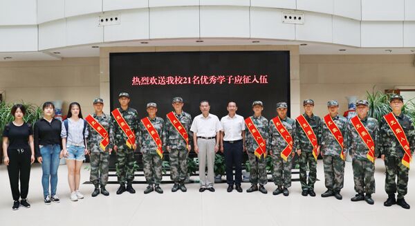 今年,我校有21名大学生在学校报名并顺利入伍,其中5名女大学生同时入伍。9月9日下午,学校举行座谈会,欢送入伍大学生。校党委书记李兴旺会前看望入伍新兵,嘱托大家严格要求,建功立业新时代,取得优异成绩,为学校争光。校党委副书记闫祖书为入伍大学生佩戴大红花,并殷切寄语。