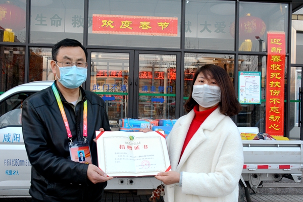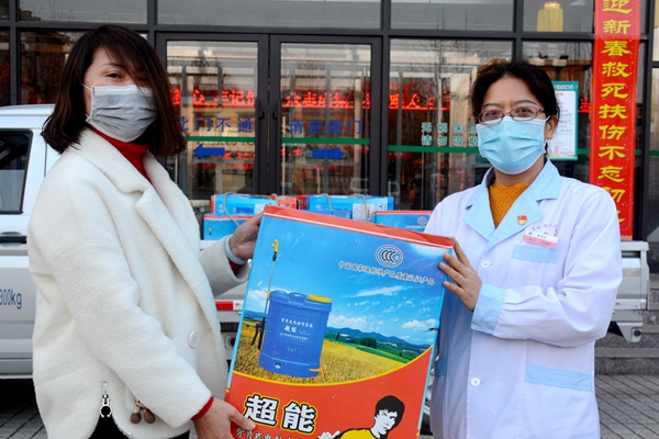 2月4日,在应对新型冠状病毒感染的肺炎疫情防控的关键时期,杨凌新三力化玻站总经理吴培丽向我校医院捐赠应急防控急需医用物资次氯酸钠消毒液一吨,背负式喷雾器一批,帮助学校抗击疫情。副校长马建华代表学校向杨凌新三力化玻站总经理吴培丽颁发捐赠证书。