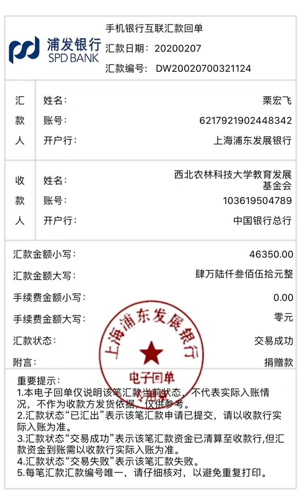 通过校友栗宏飞账户转账学校教育发展基金会账户凭证