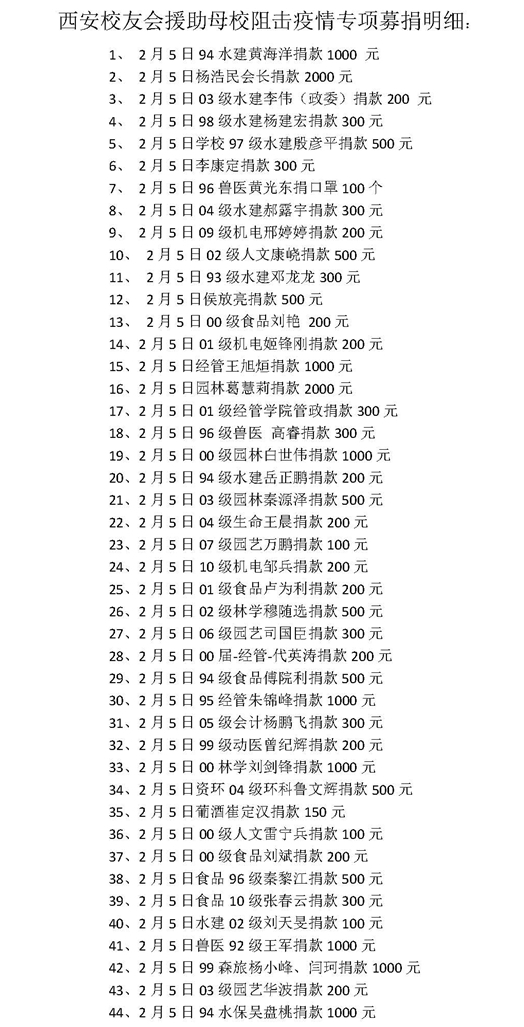 自学校校友会发出致广大校友的一封信和国资处发布募集物资公告以来,西安校友会积极响应,发出募捐倡议书和说明,积极为学校疫情防控工作募集资金和物资。截止2月6日,83 名校友和连云港校友会共捐款46350元,口罩100只。