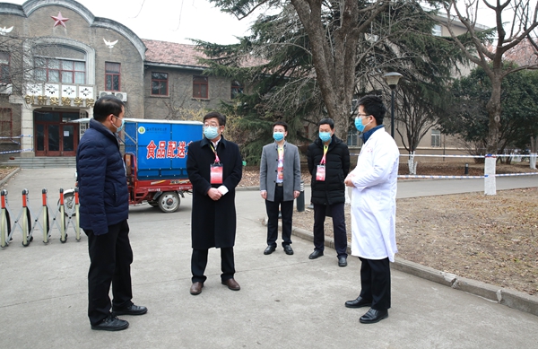 2月7日上午11点半,吴普特来到亦乐园宾馆,看望值守工作人员,期间正好遇到后勤服务中心工作人员为隔离观察学生送来盒饭。得知学生所住房间里暖气供应良好,有网络、有电视,学生们在这里情绪稳定、身体状况良好,吴普特感到放心。