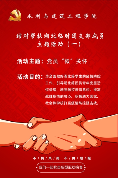 为充分发挥党员先锋模范作用,让党旗高高飘扬在疫情防控一线,水建学院精心设计党员“微”关怀主题活动,通过党支部结对湖北临时团小组、党员结对湖北临时团支部成员的形式,以党带团,点面结合,精准服务,强化思想引领,引导湖北籍团员青年不信谣、不传谣,树立信心,克服恐慌情绪,积极配合学院筑牢疫情防火墙。
