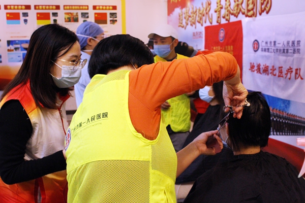 曾繁诗(左一)同招募的义剪志愿者一道为驰援武汉的医护人员服务