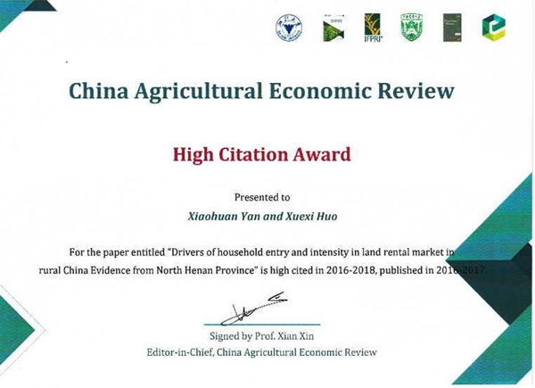 CAER全称ChinaAgriculturalEconomicReview,中文名称“中国农业经济评论”,是由中国农业大学和英国Emerald出版集团联合出版,面向全球公开发行的全英文国际学术期刊。该期刊2010年被国际知名的Social Sciences Citation Index(SSCI)和Science Citation Index Expanded(SCIE)系统同时收录,是中国大陆经济学领域第三本被SSCI收录的学术刊物。据汤森路透科技集团的最新数据,2018年影响因子为1.050。CAER“High Citation Award”由CAER杂志编辑部从过去三年发表的所有论文中选出引用最高的两篇论文,在每年年会期间颁发。