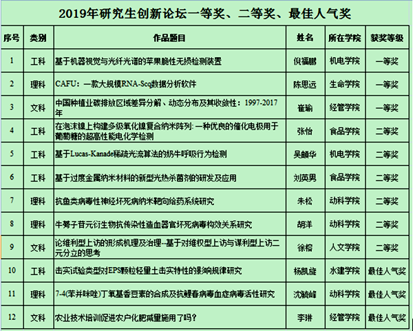 论坛通过展板展示、团队陈述、专家质询等环节,评选出2019年研究生创新论坛获奖作品,通过线上线下互动方式评出了“最佳人气奖”。经过激烈角逐,共评出一等奖3项,二等奖6项,三等奖9项,最佳人气奖3项。