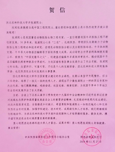 陕西省委农村工作领导小组办公室、陕西省农业农村厅给张涌院士的贺信