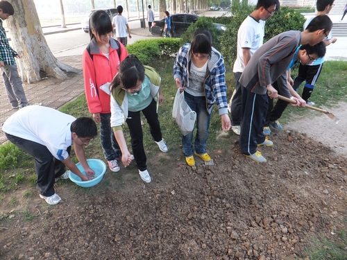 活动分为两部分,一是同学们利用铁锹、锄头等工具对校园里被践踏的草坪进行翻整,随后在整好的土地里播下草籽,期盼受损的草坪得以恢复;另一方面,同学们通过发放环保知识宣传单、设立环保标识牌的方式传播环保理念。由于种草路段碎石子较多,土质坚硬,难以开挖,但是学生们克服困难,毫不气馁。经过一个多小时辛勤劳动后,一块块的草地种了起来。