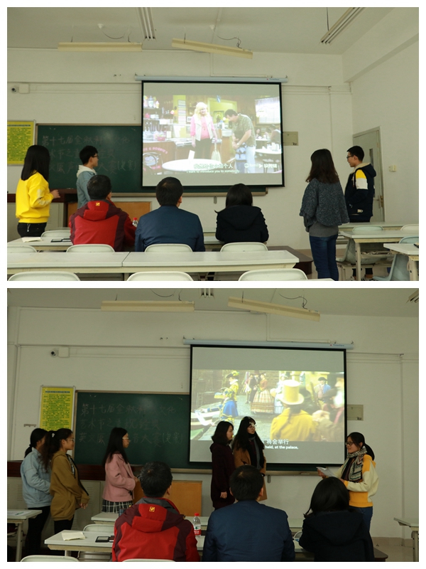 本次配音大赛复赛共有来自各院系的26支队伍参赛,比赛精彩纷呈,现场掌声不断。来自外语系的马凤岐同学带领她的团队完美展示了《Beauty and beast》原版电影的风采,尤其是演唱了电影中的一首插曲让评委老师赞不绝口;来自林学院的王赟颖同学的团队重现《Paddington Bear》中人类与动物的感人故事;自外语系的田逸云同学和她的搭档表演《萌黄&宝贝老板》,把小黄人的活泼滑稽表现的十分到位,现场笑声不断;来自农学院的彭瑞霄同学参赛作品为《教父1》,他独自挑战教父一角,略带磁性的声音把教父正直的一面表现的淋漓尽致。更有《疯狂动物城》、《灰姑娘》、《冰雪奇缘》等耳熟能详的动画作品同样精彩纷呈、引人入胜。演员们道具准备充足,动作惟妙惟肖,让观众身临其境,得到了评委老师的一致好评。张鹏老师赛后表示,选手整体表现都不错,但在语音语调方面还有待加强,期待你们能够站在北绣舞台上带来更好的表演。选手们流畅的对话、到位的动作和表情,将作品中的人物特点演绎得淋漓尽致,恰到好处。