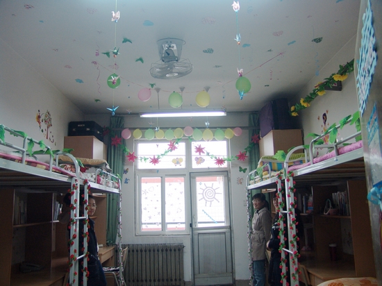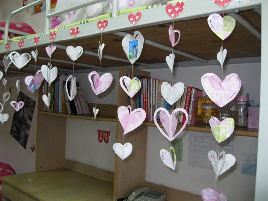 参评的女生宿舍可谓争奇斗艳,绚烂多彩;风格各异,特点鲜明。有的以蓝色为主色调,营造出梦幻的感觉;有的以“爱”为主题,满屋的温馨让人感受到家的温暖;有的装扮成了“花海”,驻足观看,仿佛能感受到阵阵扑鼻的花香。其中,名为“爱满阁”的1-533宿舍的成员们,用灵巧的双手,将千纸鹤化作了一颗暖暖的心,并搭配以剪纸做成的心型垂帘,获得了评委团的一致好评。