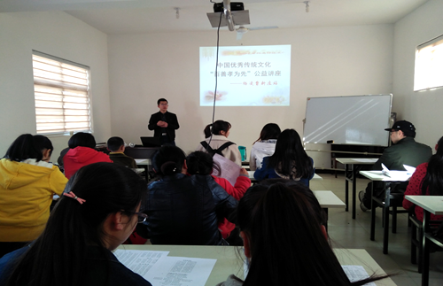在主持人简要地介绍了此次讲座的目的后,主讲人董军开始为大家讲解中国传统文化中的孝道。主讲人通过生动形象的话语以及播放有关孝道的小视频,从《跪羊图》到弟子规,给大家阐明了孝道的重要性,最后在大家一起朗读《弟子规》后,此次讲座圆满结束。正如《弟子规》中所说“首孝悌,次谨信”;本次讲座后,听众纷纷点头称赞,表示更能深入的理解传统文化中博大精深的孝道文化。