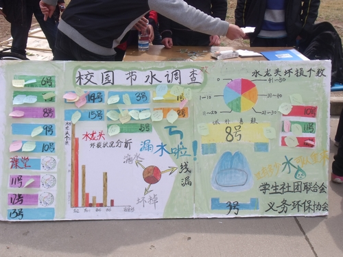 作为“西农水周”系列活动,当天的宣传活动准备充分。活动前期协会成员已经对学生社区宿舍楼水龙头的损坏及报修情况进行了为期一周的调查,并以纪实宣传板的形式展示出来,收效良好。另外,协会还通过水资源图片展、有奖竞答等多种形式,吸引了众多同学的积极参与。