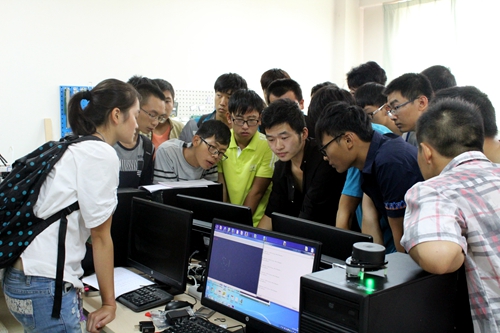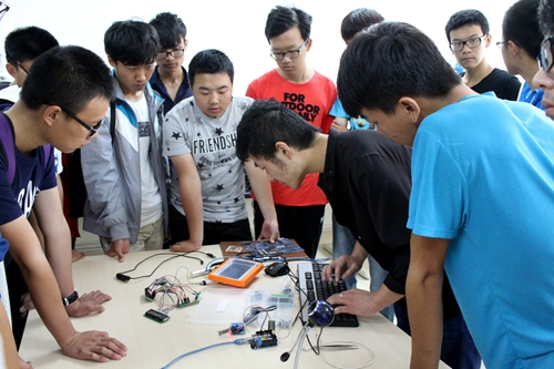 10点钟,来展览会参观的人数达到了顶峰!各种仪器相继开启,整个屋内的同学聚集在学长的身侧,听他讲解3D打印机的相关配套设施——台式扫描仪以及各种打印前准备。同学们汇聚在3D打印机前,伴随着机器有节奏的运作声,平台按指定路径的移动,作品一点点的显现在同学们面前。观看展览的许多同学对这里充满向往,其中电信1601的陈智维同学当场报名参加创客之家,他说到“在这里可以和学长学姐交流学习,学到做科创的知识,更能实际动手,结合自己的学业相互提高!”。