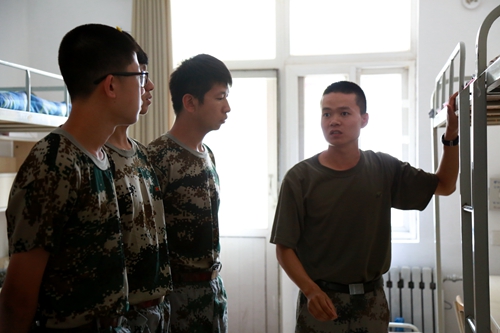 教官检查内务,指导整理床铺