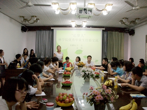 2012届研究生毕业在即,为充分发挥优秀毕业生对学子的引领和榜样作用,解决同学们对于考博、出国以及就业的困惑,明确今后的学习目标和就业去向, 6月16日晚,林学院研究生会在学院五楼会议室举办主题为“追梦人——林学院优秀研究生毕业生经验交流”的座谈活动,考取中国科学院武汉植物研究所生态学博士研究生的吴昊、赴格罗宁根大学攻读空间规划方向博士学位的张杨、赴University of Amsterdam的张倩倩以及考取清华大学核能与新能源技术研究院环境工程专业博士研究生的刘娜利与低年级同学们共同交流,分享学习、科研、以及出国经验。