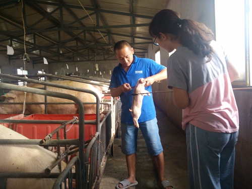 队员们随养殖场技术员来到保育舍,在讲解完猪场常见病大概情况后,便开始了具体病例的观察诊断。通过仔猪粪便情况及呼吸频率,判断猪仔是否打抗生素或者是否患有肺部疾病,并学习了所用相应的药物。与此同时,队员们跟随技术员为一周龄左右的仔猪注射猪瘟疫苗与圆环病毒疫苗,为猪场夏秋季的常见传染病做了有效防御。