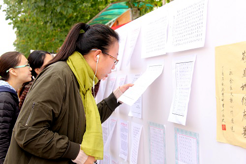 为庆祝十九大胜利召开,激发我校学子的爱国情怀,营造浓厚校园文化氛围,10月19日,化学与药学院于西区雕塑前举办“喜迎十九大,共承笔墨情”书法比赛初赛优秀作品展览。