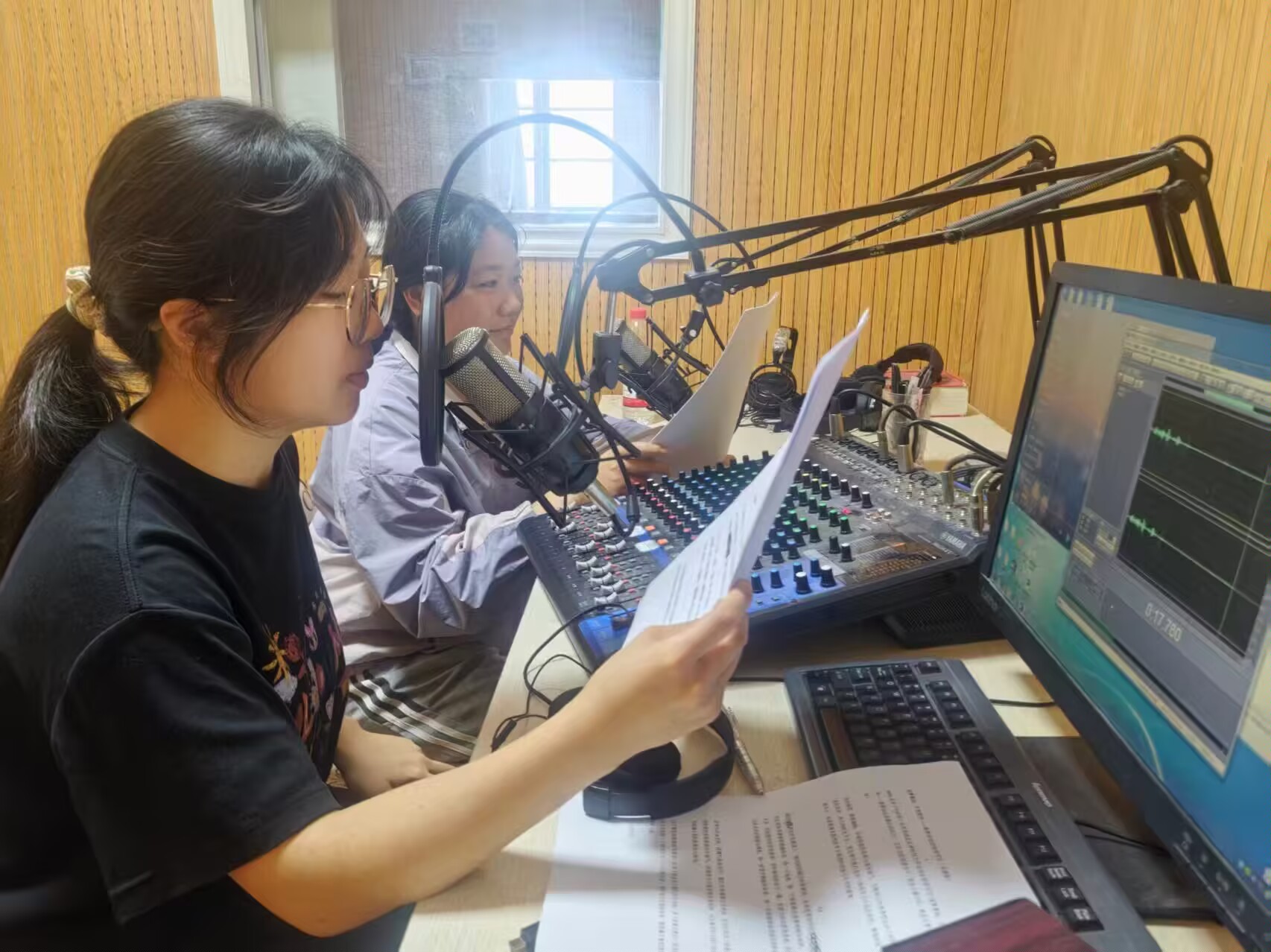 广播台主播:李佳钰,张锦岚同学正在广播室录音