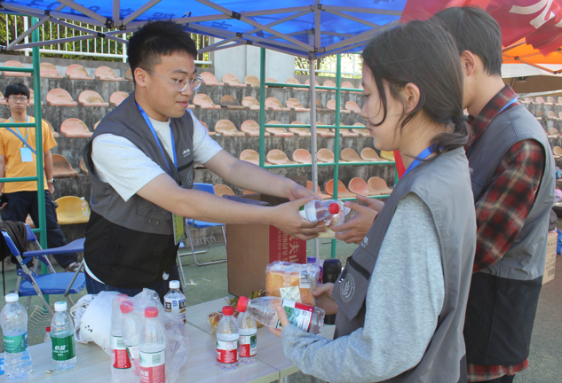 综合办公室蔡学森同学正在给同学们发放水和面包等物资