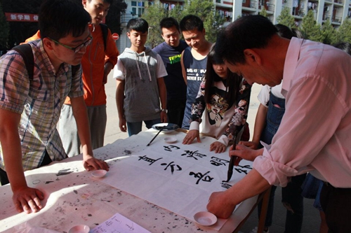 老师们现场摆好笔墨纸砚,写了许多字画送给现场的同学。