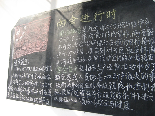 实践部部分成员帮助黎陈村制作主题为“两会进行时”的板报。根据村里工作人员的要求,板报的内容为“综治维稳,安全生产”。成员们齐心协力,画画写字排版,有条不紊地完成了任务,获得了村里干部的一致好评。成员们也在这次活动中感受深刻地感受到了两会的精神和奉献的喜悦。